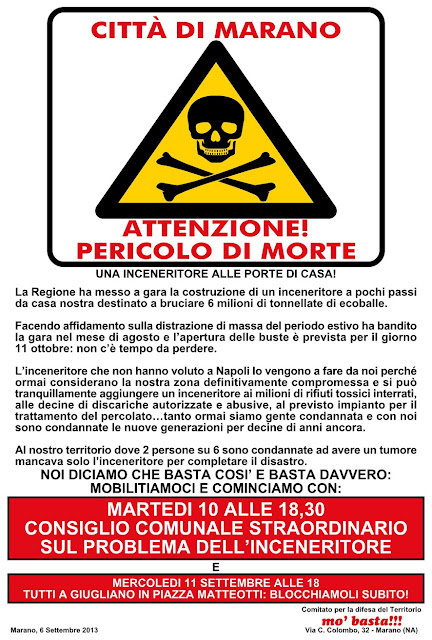 Con un comportamento che non è meno vigliacco di quello tenuto da chi ha nascosto nottetempo sotto i nostri piedi milioni di bidoni tossici il Commissario ai Rifiuti per la Campania ha bandito in pieno periodo estivo una gara per la costruzione di un inceneritore da 600.000 tonnellate all’anno nel territorio Giuglianese (nei pressi di Torre Carinati), a un tiro di schioppo da casa nostra, e solo alla ripresa post estiva la maggior parte dei cittadini è venuta a sapere che il giorno 11 ottobre alle ore 12 la gara si conclude con l’apertura delle buste e la scelta del contraente: è lo stupro cosciente della democrazia